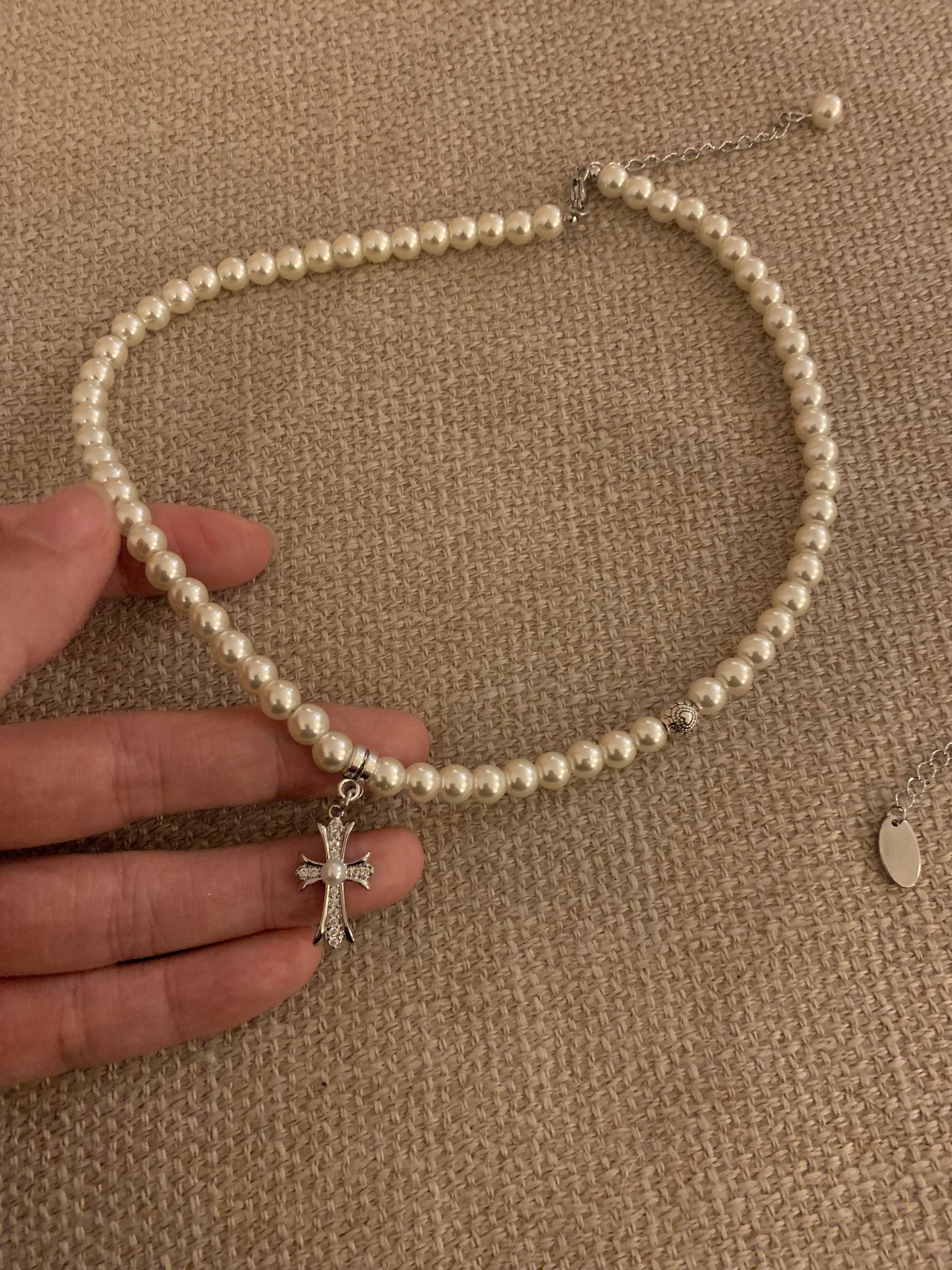 100029-High-quality imitation pearl planet necklace with cross pendant, plated with real gold and with high color retention